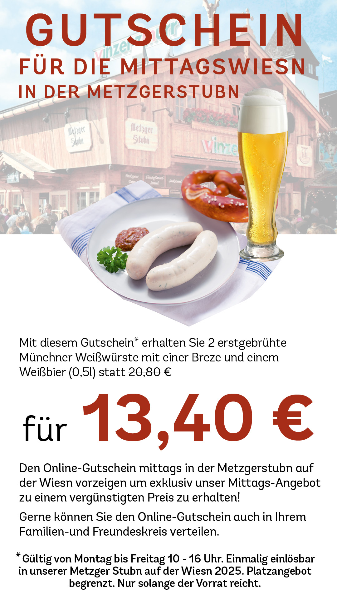Mit diesem Gutschein* erhalten Sie 2 erstgebrühte Münchner Weißwürste mit einer Breze und einem Weißbier (0,5l) statt für 20,80 € für 13,40 €